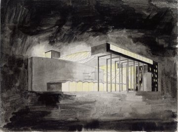 Abb.: Alvar Aalto. Oper und Musiktheater, Essen, 1959; 1961–1988, Bleistift und Farbstift auf Transparentpapier, 30 × 47,5 cm © Alvar Aalto Foundation